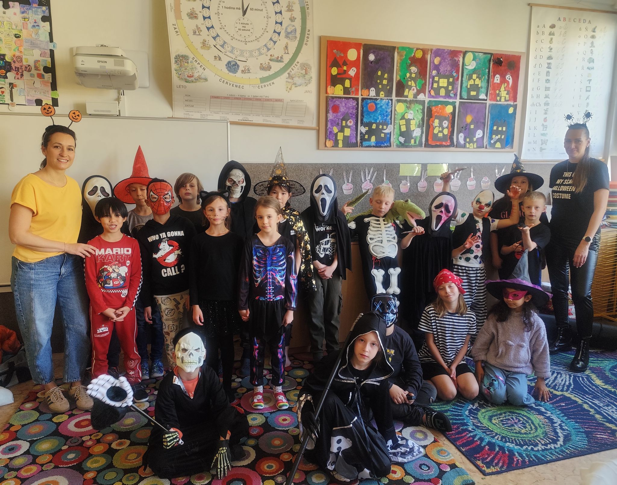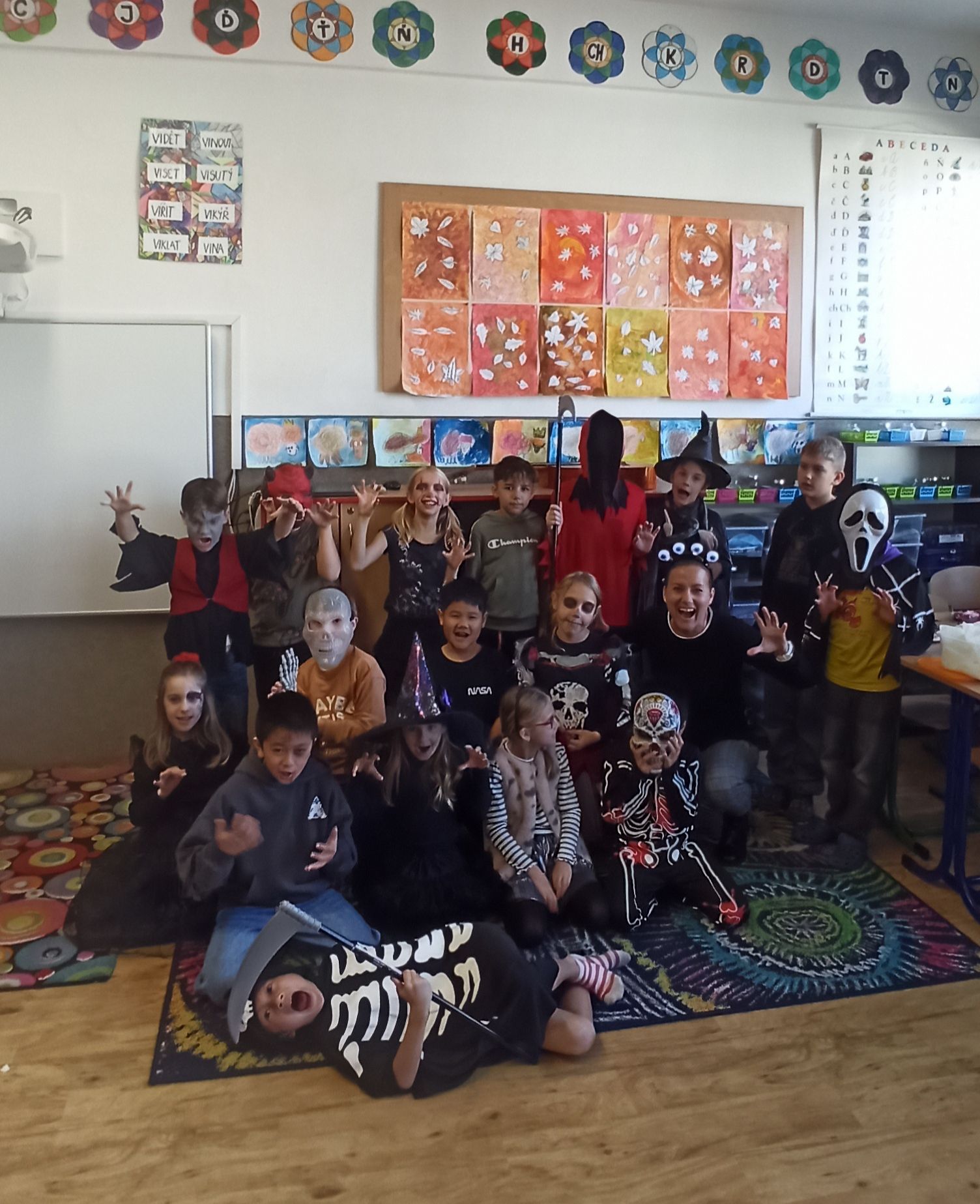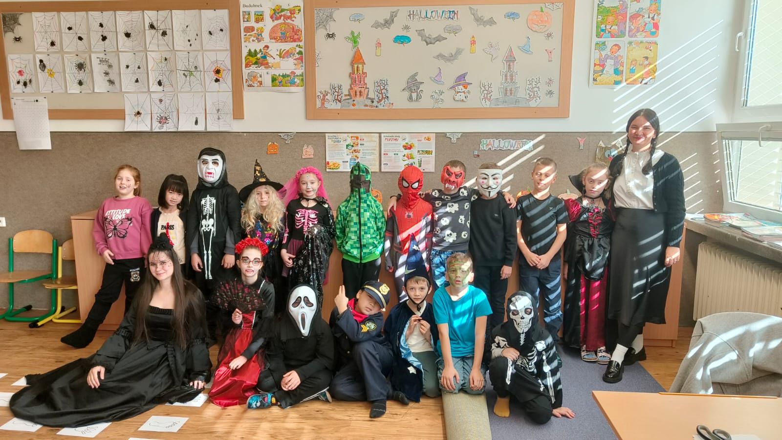Paní vychovatelky z družiny i paní kuchařky v jídelně každý rok vytváří halloweenskou náladu v podobě krásných dekorací – a členové školního parlamentu nechtěli zůstat pozadu. Na dnešní den vyhlásili den v halloweenských převlecích. Ve třídách kromě kostýmů vládly tematicky zaměřené hry a aktivity, které si pro děti přichystaly paní učitelky – jak to v některých třídách vypadalo, můžete zjistit z fotogalerie.