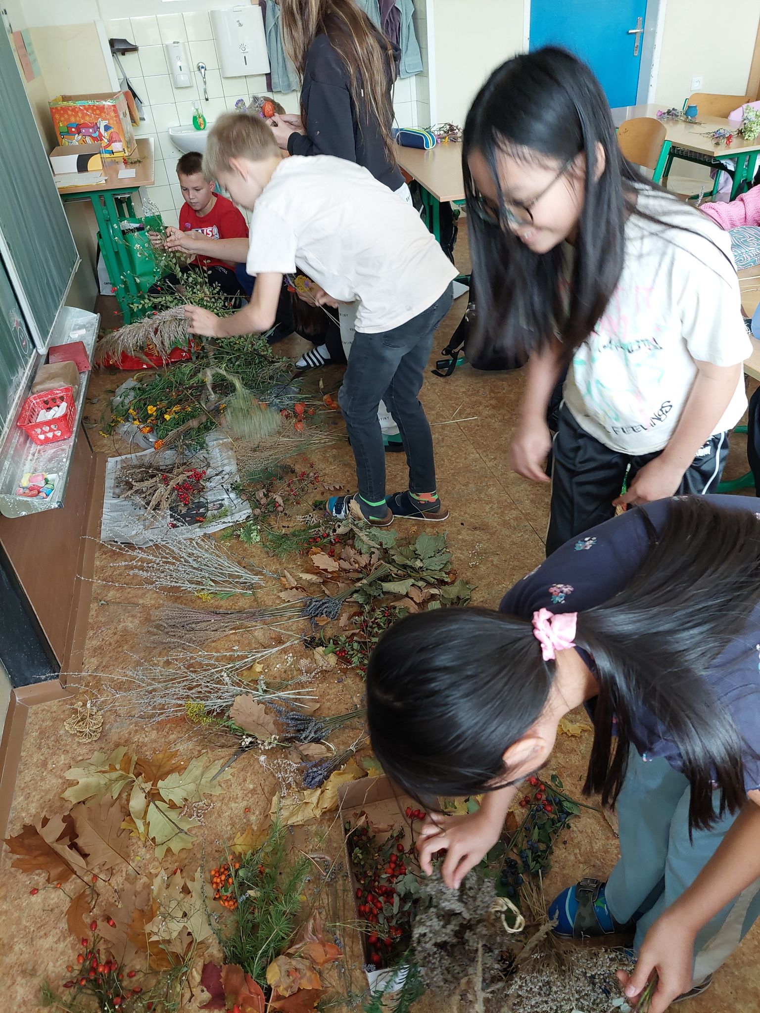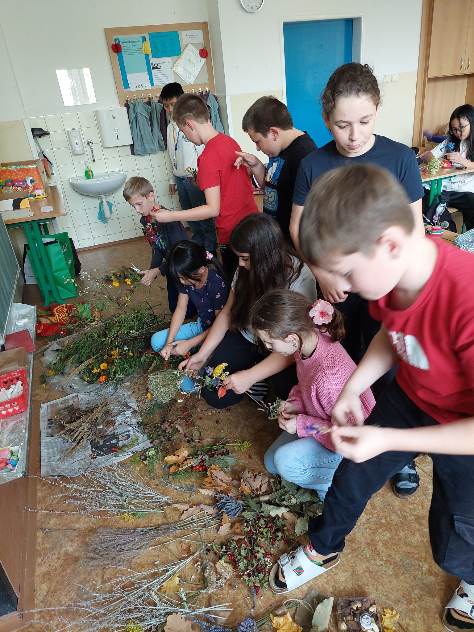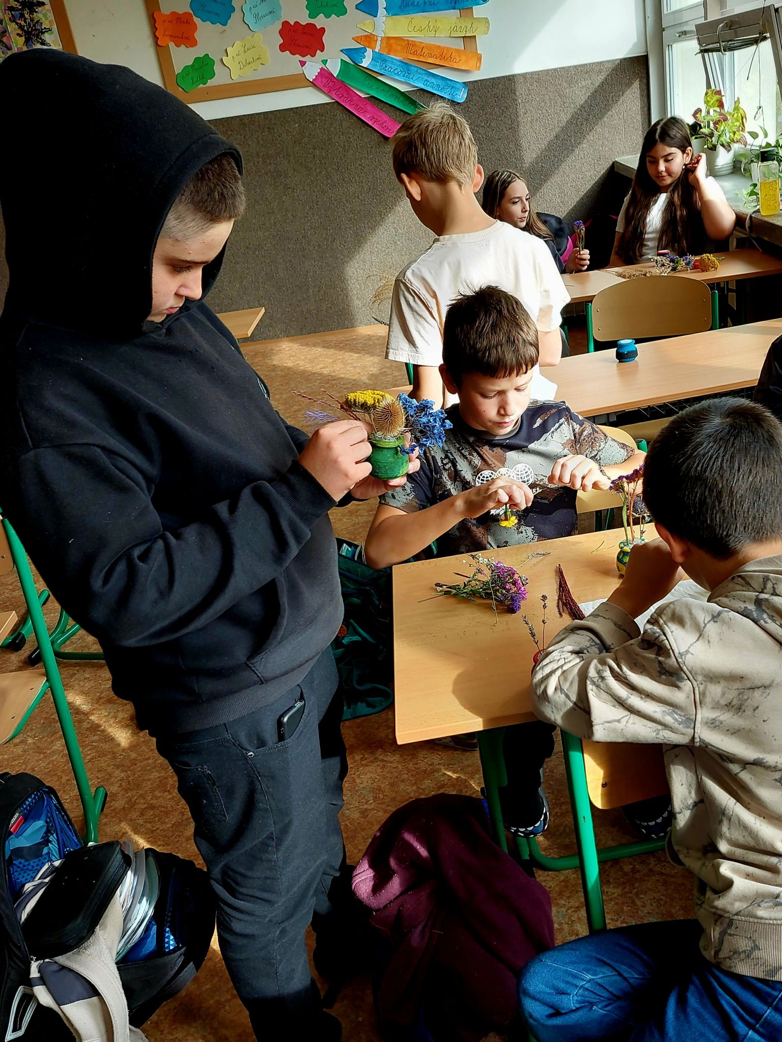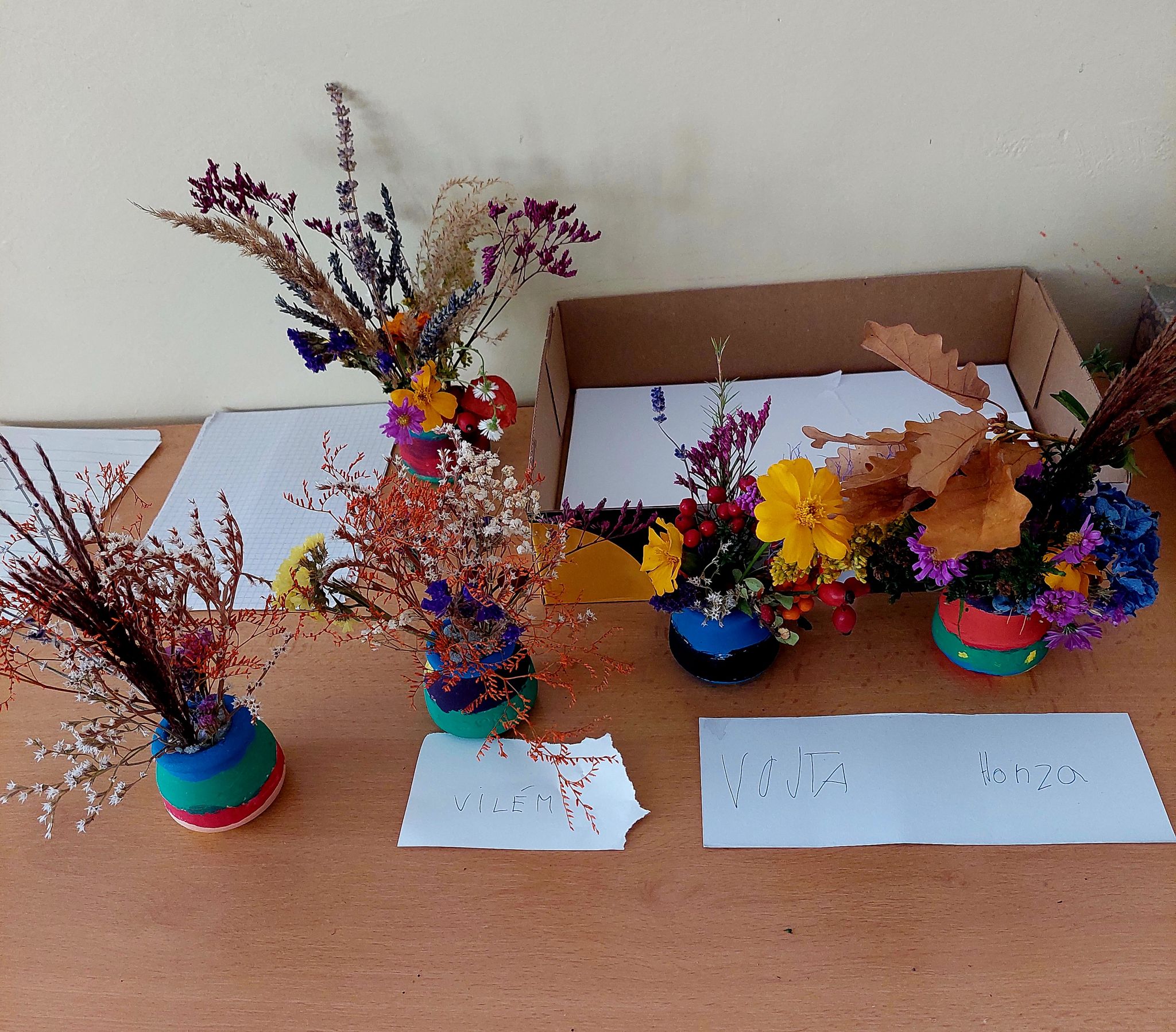 V praktických činnostech jsme si tentokrát vyzkoušeli práci floristů a pustili se do aranžování keramických váziček suchým přírodním materiálem. Třída byla příjemně provoněná, tvoření nás bavilo, a protože sušeného i čerstvého materiálu jsme měli velké množství, vypichovali jsme ještě další improvizované nádoby, které zdobí okna na školní chodbě. Těšíme se, že tvoření z přírodního materiálu si znovu zopakujeme, třeba ….….. před Vánocemi.