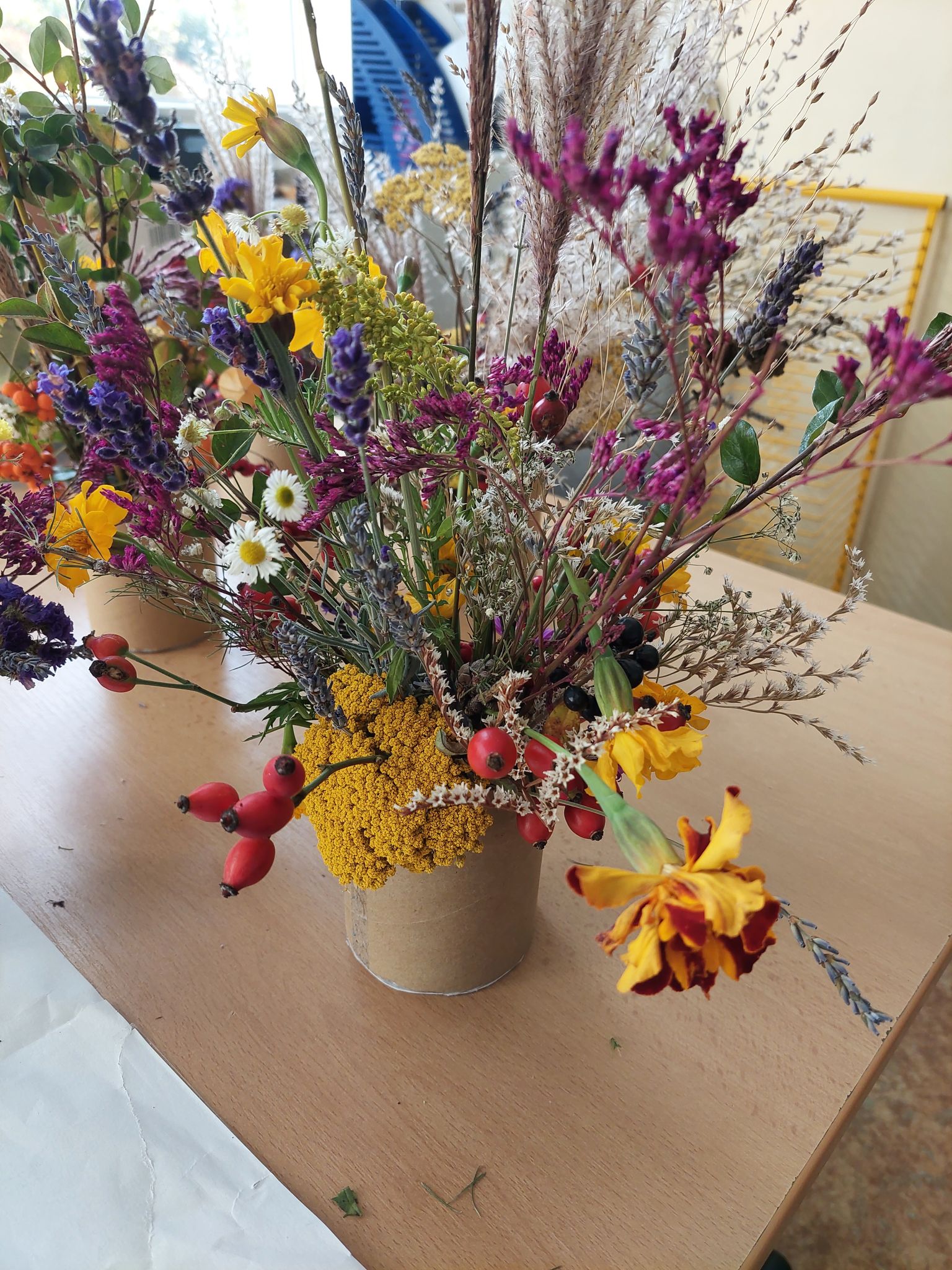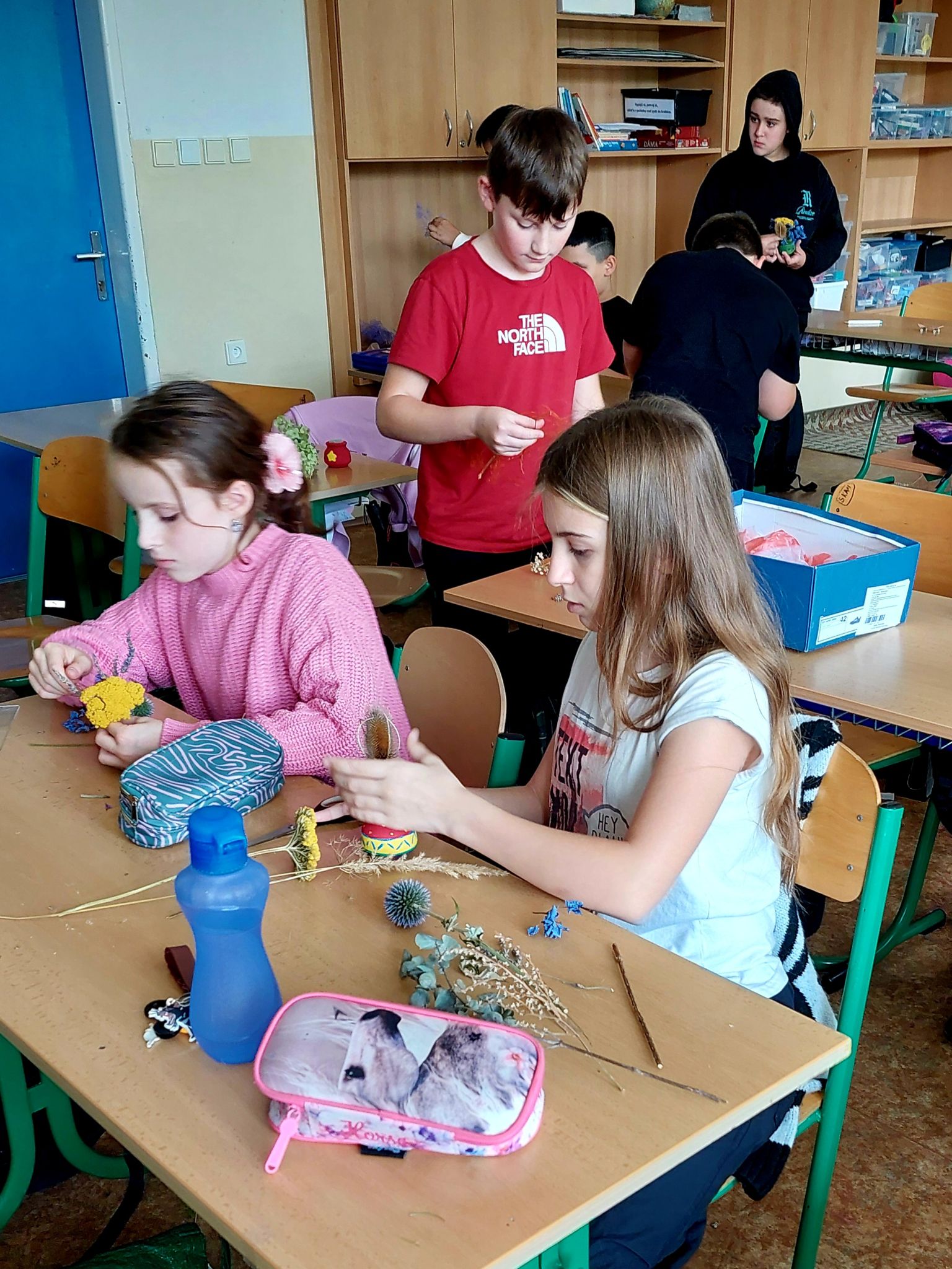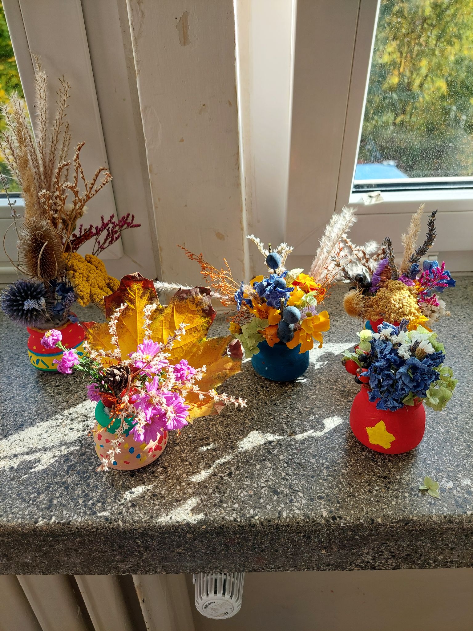 V praktických činnostech jsme si tentokrát vyzkoušeli práci floristů a pustili se do aranžování keramických váziček suchým přírodním materiálem. Třída byla příjemně provoněná, tvoření nás bavilo, a protože sušeného i čerstvého materiálu jsme měli velké množství, vypichovali jsme ještě další improvizované nádoby, které zdobí okna na školní chodbě. Těšíme se, že tvoření z přírodního materiálu si znovu zopakujeme, třeba ….….. před Vánocemi.